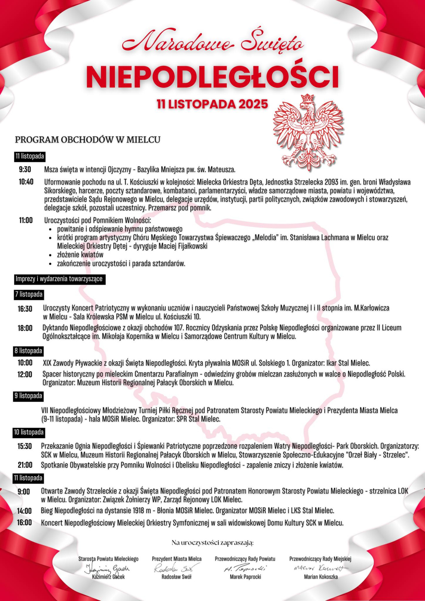 16:30 - Uroczysty Koncert Patriotyczny w wykonaniu uczniów i nauczycieli Państwowej Szkoły Muzycznej I ill stopnia im. M.Karłowicza w Mielcu - Sala Królewska PSM w Mielcu ul. Kościuszki 10.
