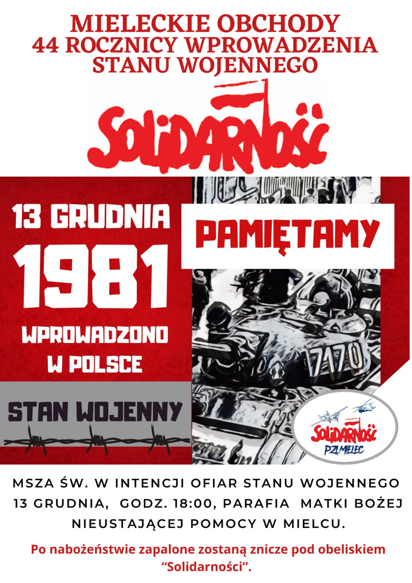 13 grudnia (sobota) 2025 r. w parafii Matki Bożej Nieustającej Pomocy w Mielcu odprawiona zostanie msza święta w intencji ofiar stanu wojennego.