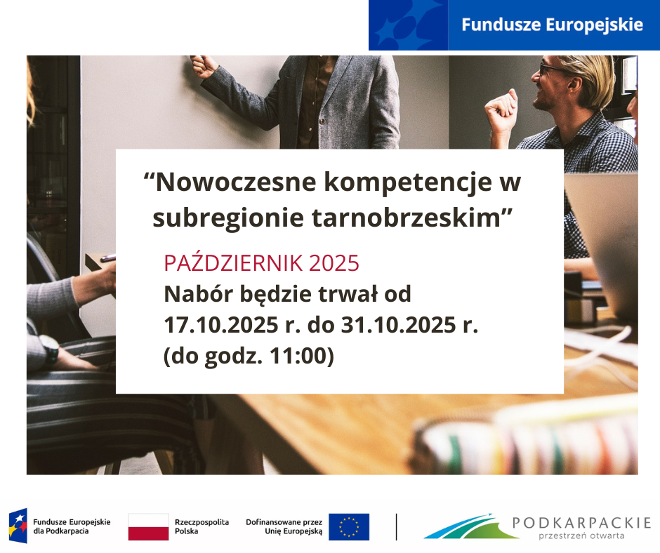 Najbliższy termin naboru do 9 rundy projektu „Nowoczesne kompetencje w subregionie tarnobrzeskim” rozpocznie się 17.10.2025 r. i potrwa do 31.10.2025 r. do godz. 11:00.