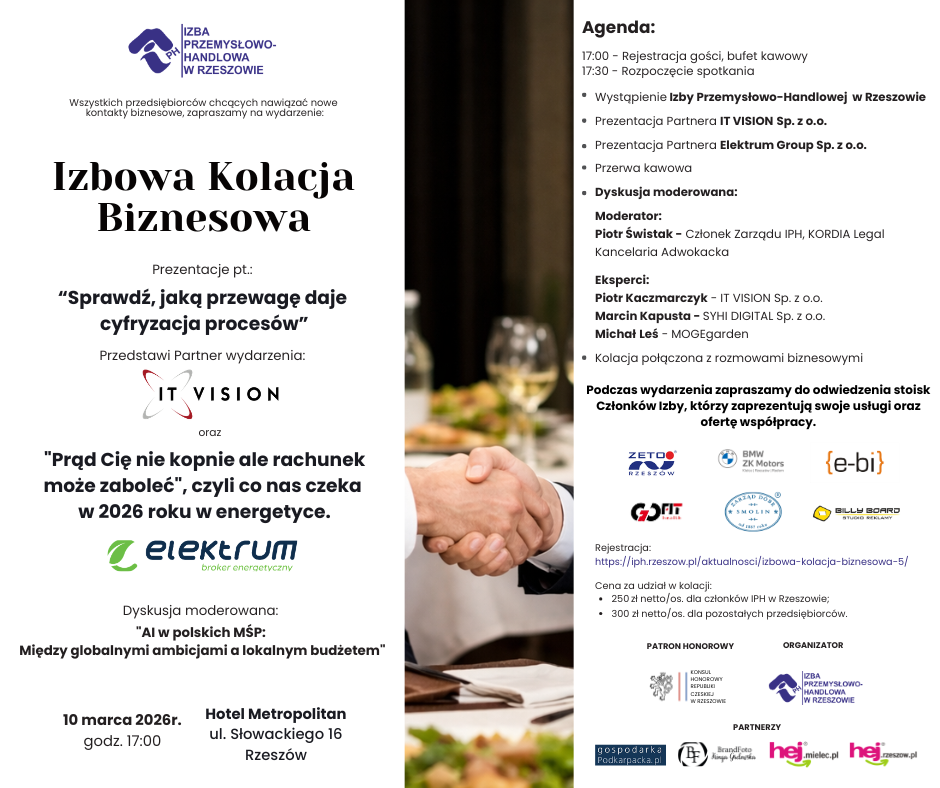 Izba Przemysłowo-Handlowa w Rzeszowie zaprasza wszystkich przedsiębiorców na kolejną edycję Izbowej Kolacji Biznesowej. Wydarzenie odbędzie się 10 marca 2026 roku o godzinie 17:00 w Hotelu Metropolitan (ul. Słowackiego 16, Rzeszów).