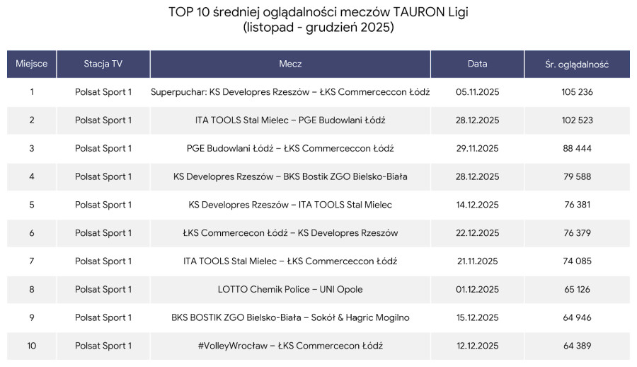 Szczególnie cieszy fakt, że na drugim miejscu ogólnopolskiego zestawienia TOP oglądalności znalazł się mecz rozegrany w Mielcu. Spotkanie ITA TOOLS Stal Mielec – PGE Budowlani Łódź obejrzało średnio ponad 102 500 widzów. To drugi najlepszy wynik w Polsce w listopadzie i grudniu 2025 roku.