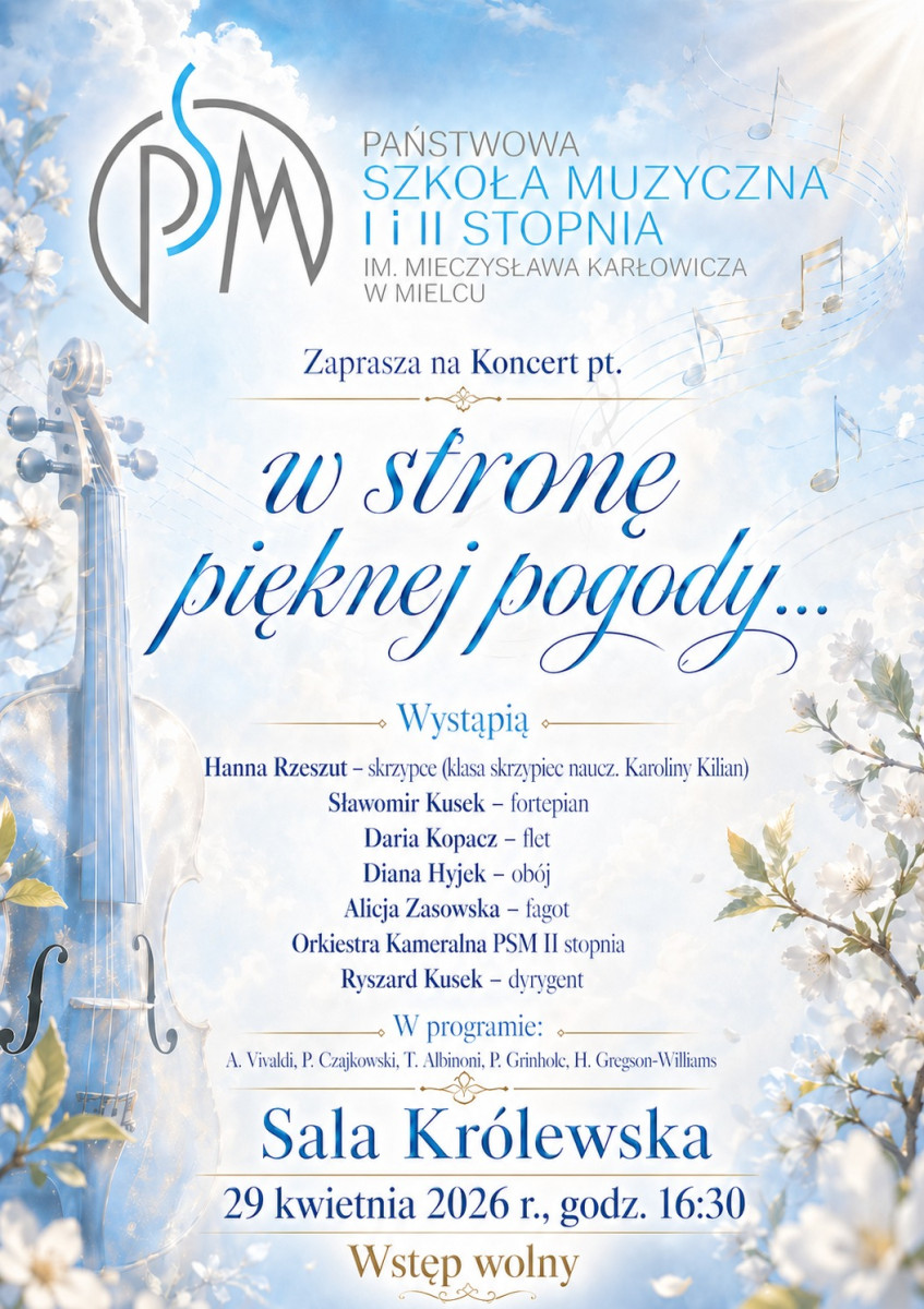 Państwowa Szkoła Muzyczna I i II stopnia im. Mieczysława Karłowicza w Mielcu zaprasza mieszkańców na koncert pt. „W stronę pięknej pogody…”, który odbędzie się 29 kwietnia o godz. 16:30 w Sali Królewskiej.