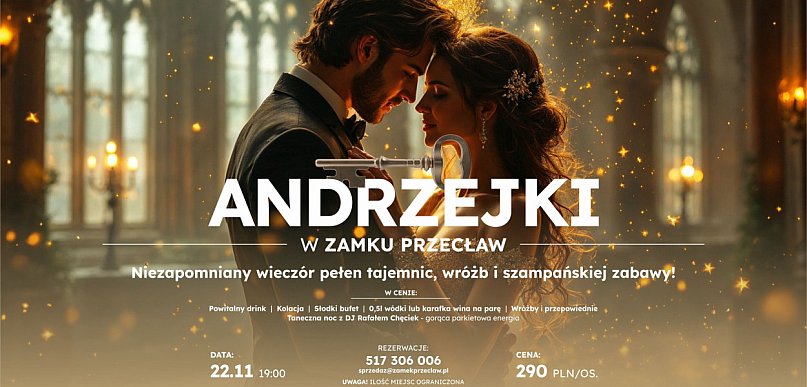 Zapraszamy 22 listopada do Zamku Przecław na niezwykłe andrzejkowe spotkanie, które połączy tradycję wróżb z niepowtarzalnym klimatem zabytkowych wnętrz. To idealna okazja, by świętować w miejscu o wyjątkowej atmosferze — w murach, które opowiadają swoją historię, przy przygaszonym świetle świec i dźwiękach starannie dobranej muzyki.