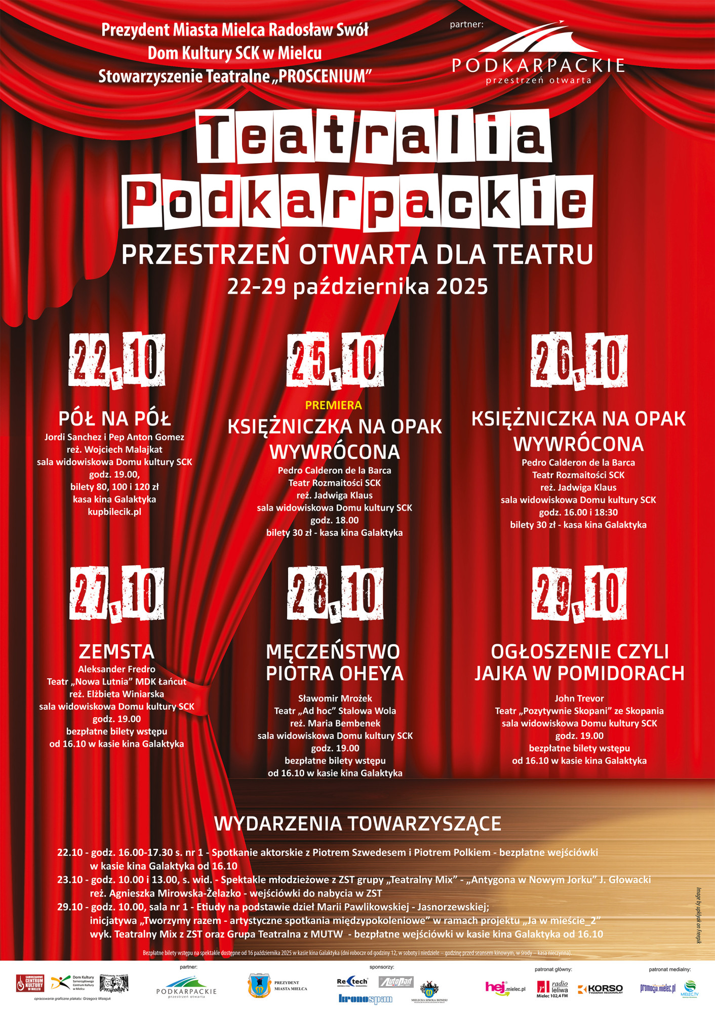 Teatralia w Mielcu to cykl spektakli zaplanowanych w ciągu jednego, obecnie trwającego tygodnia. Rozpoczęły się we wtorek. Oficjalnej inauguracji Teatraliów Podkarpackich dokonali 22 października: zastępca Prezydenta Mielca Tomasz Leyko, dyrektor Samorządowego Centrum Kultury Damian Małek, prezes Stowarzyszenia Teatralnego „Proscenium”, Janusz Pacholec oraz kierownik działu zespołów artystycznych DK SCK Bartosz Kramarz.