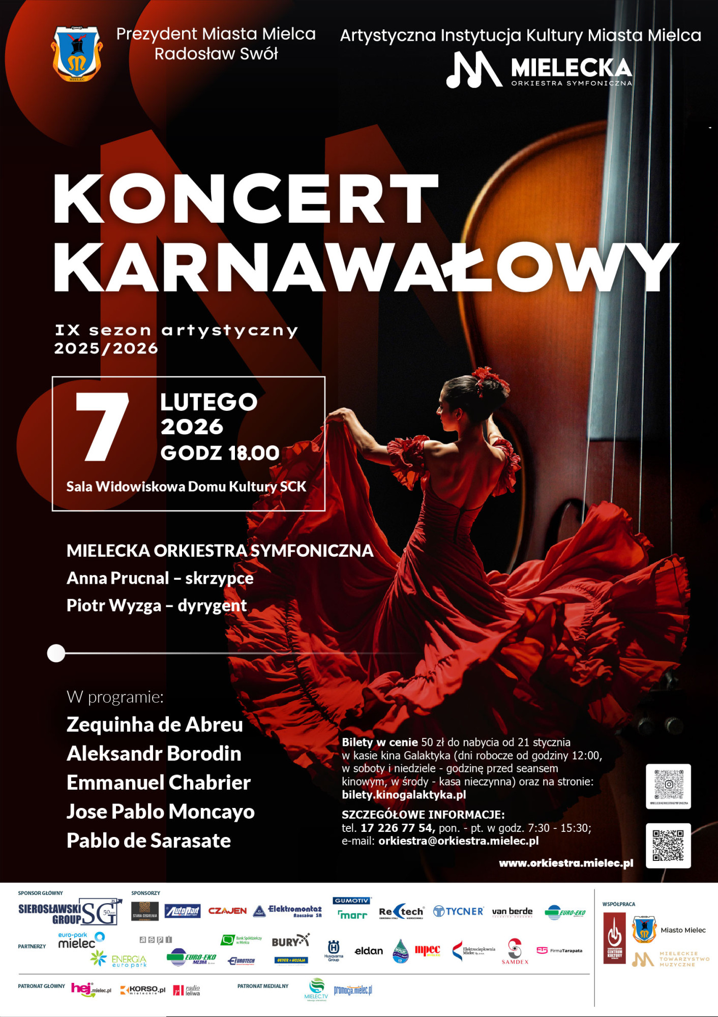 Latynoamerykańskie, romskie i orientalne melodie zdominują karnawałową prezentację symfoników mieleckich, tym razem sięgających po światowe dziedzictwo rustykalnych motywów zabawowych. Nie oznacza to jednak wykonawczej trywialności, a przeciwnie, wyrafinowane stylizacje z elementami wirtuozowskimi. Energetycznym, momentami wręcz żywiołowym koncertem Mielecka Orkiestra Symfoniczna podsumuje intensywny artystycznie okres przełomu roku.