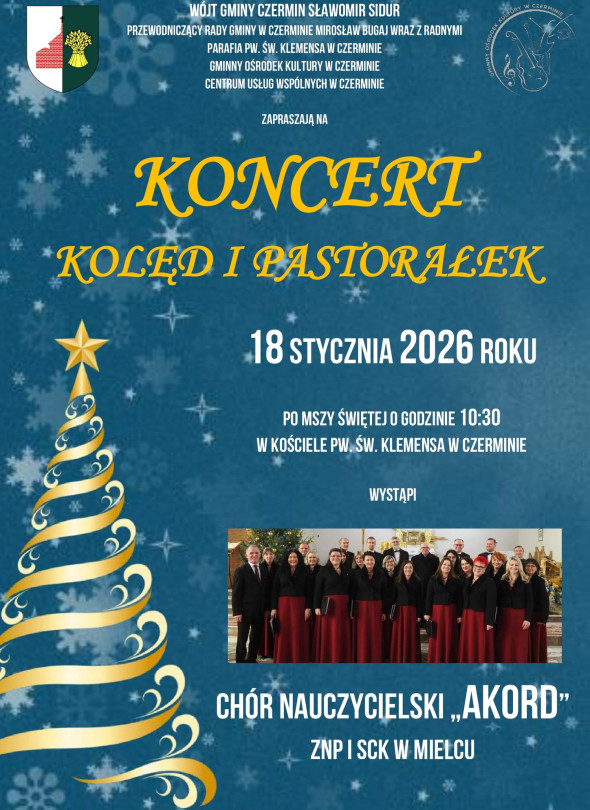 Wójt Gminy Czermin, Rada Gminy, Parafia, Gminny Ośrodek Kultury i Centrum Usług Wspólnych zapraszają na Koncert Kolęd i Pastorałek. Tego ranka usłyszycie piękne wykonania tradycyjnych pieśni bożonarodzeniowych w wykonaniu prestiżowego Chóru Nauczycielskiego "AKORD" ze Szkoły Muzycznej Wzniesienia Pańskiego i Społecznego Chóru Kameralnego w Mielcu.