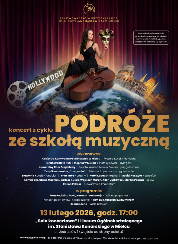 Państwowa Szkoła Muzyczna II stopnia im. Mieczysława Karłowicza w Mielcu zaprasza na koncert z cyklu „Podróże ze szkołą muzyczną”, który odbędzie się 13 lutego 2026 roku o godz. 17:00 w sali koncertowej I Liceum Ogólnokształcącego im. Stanisława Konarskiego w Mielcu.