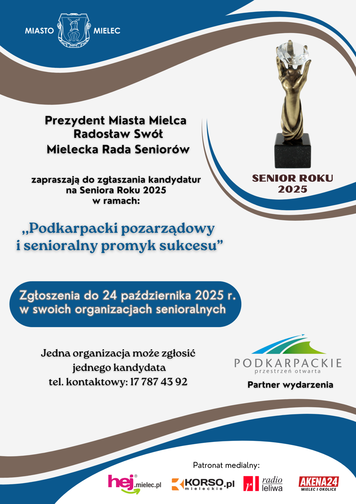 Prezydent Miasta Mielca dr Radosław Swół i Mielecka Rada Seniorów ogłaszają konkurs dla mieleckich seniorów i zapraszają do zgłaszania kandydatów – aktywnych, inspirujących i pełnych pasji, którzy swoją działalnością wzbogacają życie społeczne miasta Mielca.