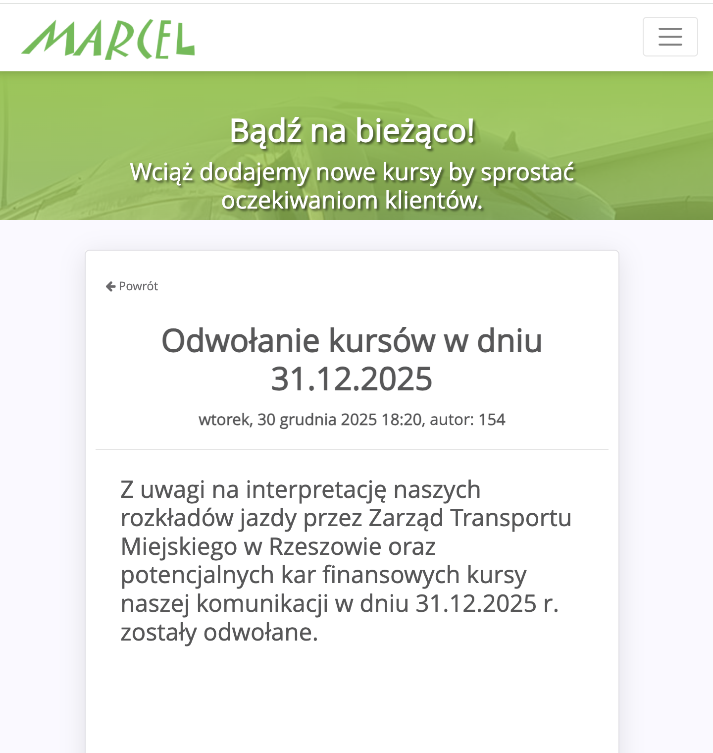 W wyniku konfliktu z Zarządem Transportu Miejskiego w Rzeszowie, prywatni przewoźnicy busowi anulowali wszystkie swoje kursy w dniu 31 grudnia 2025 roku.