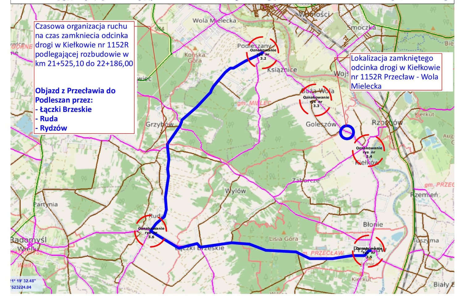 Objazd z Przecławia będzie odbywał się drogami powiatowymi przez miejscowości Łączki Brzeskie, Rudę, Rydzów.