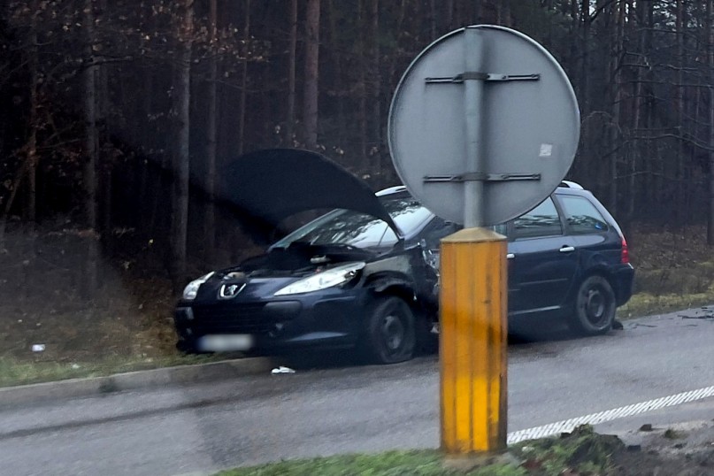 Na drodze tuż przed rondem zderzyły się dwa pojazdy: Peugeot i Suzuki.