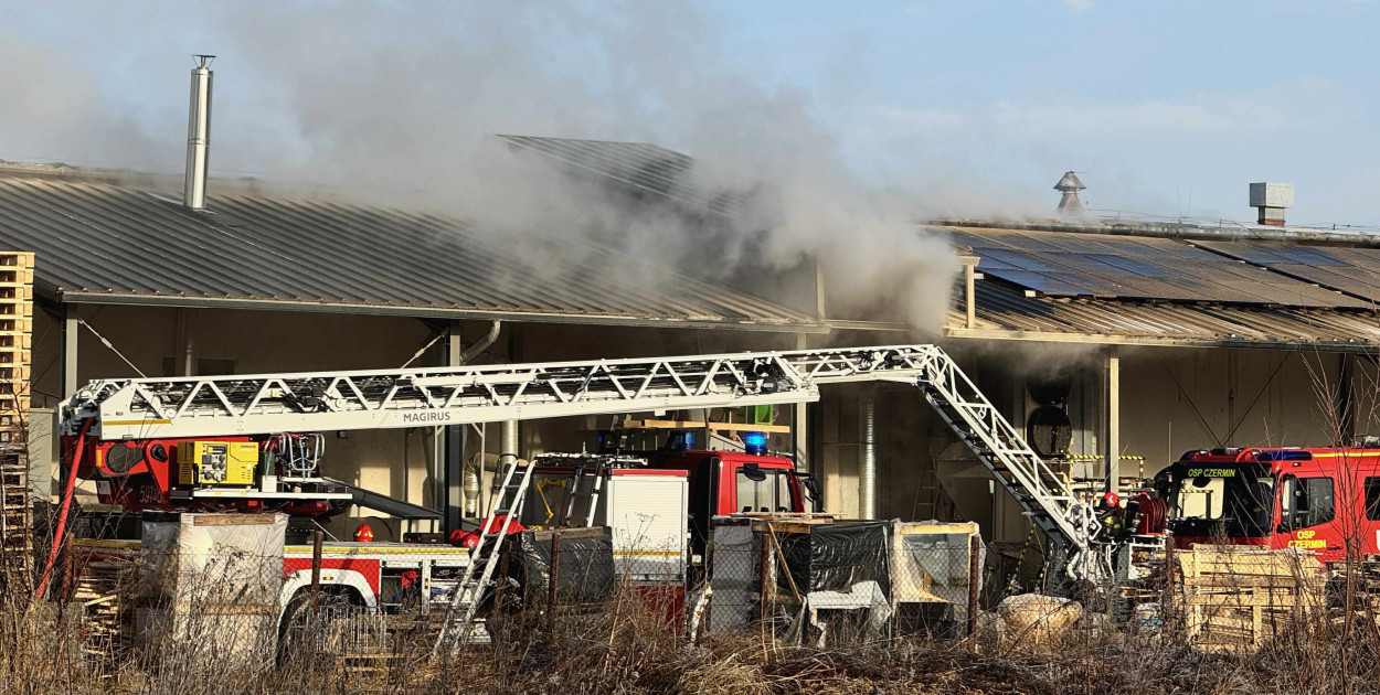 Służby zawiadomienie o pożarze otrzymały we wtorek po godzinie 8:00. Ogień zauważono w hali zakładu produkującego pellet w miejscowości Trzciana.