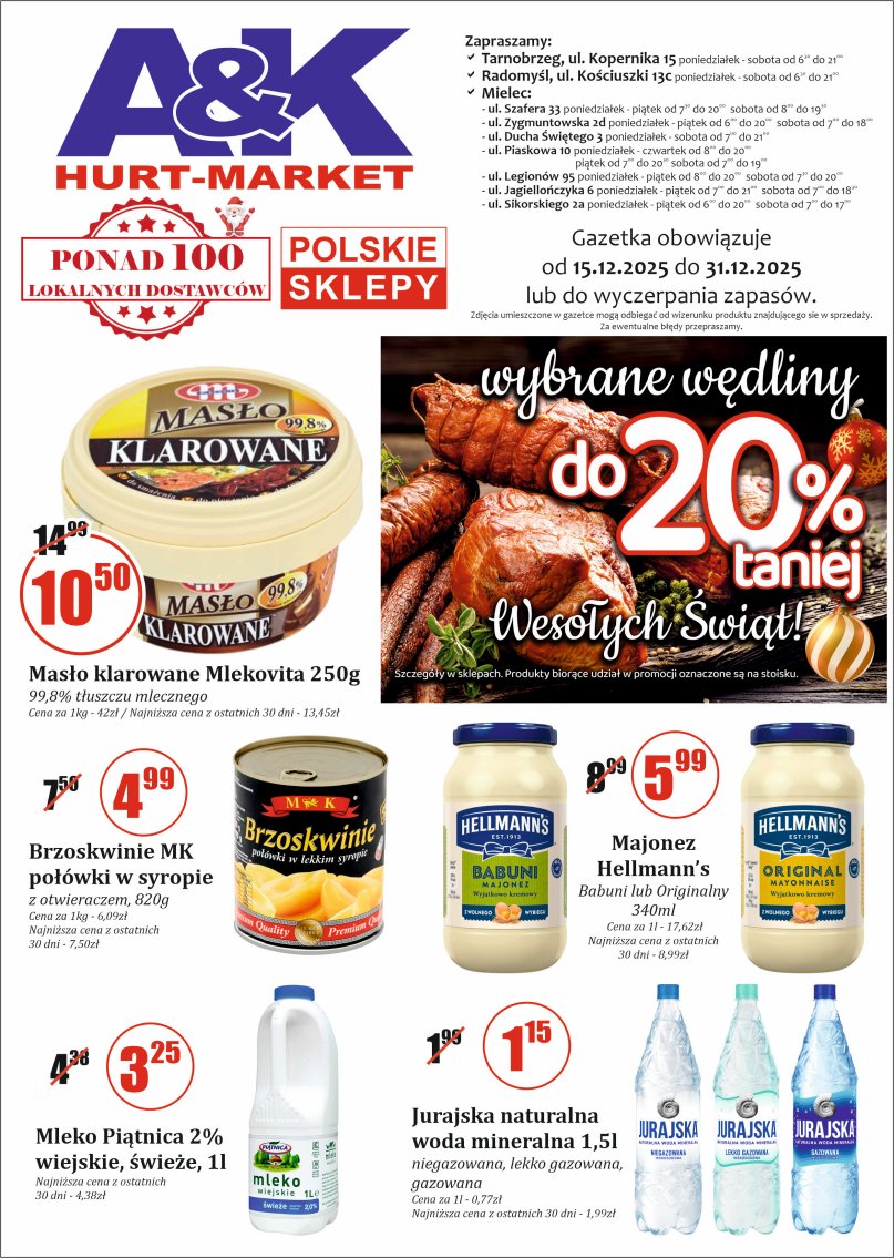 W drugiej połowie grudnia lokalne sklepy A&K przygotowały dla mieszkańców regionu specjalną ofertę promocyjną, która ułatwi przygotowania do świąt Bożego Narodzenia oraz Sylwestra. Gazetka obowiązująca od 15 do 31 grudnia 2025 roku obejmuje szeroki wybór produktów spożywczych i artykułów codziennego użytku – w atrakcyjnych cenach i z naciskiem na współpracę z lokalnymi dostawcami.