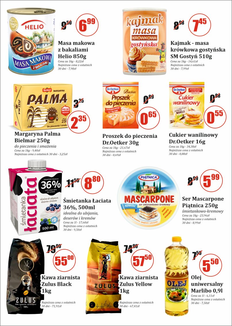 W ofercie znalazły się m.in. produkty niezbędne do świątecznego pieczenia i gotowania: masło klarowane, mleko, śmietanki, mascarpone, mak, bakalie, przyprawy oraz popularne dodatki, takie jak masa makowa czy kajmak. Nie zabrakło również kaw ziarnistych, olejów, przetworów warzywnych i owocowych.
