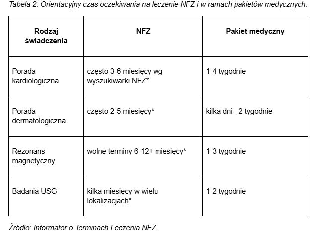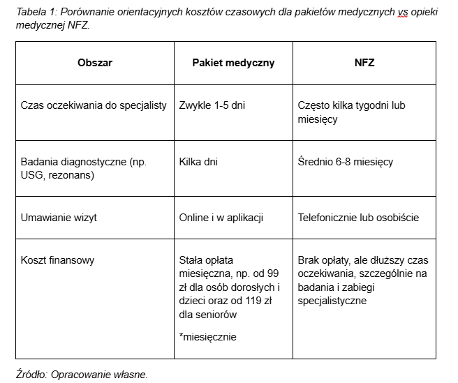 Tabela 1: Porównanie orientacyjnych kosztów czasowych dla pakietów medycznych vs opieki medycznej NFZ.