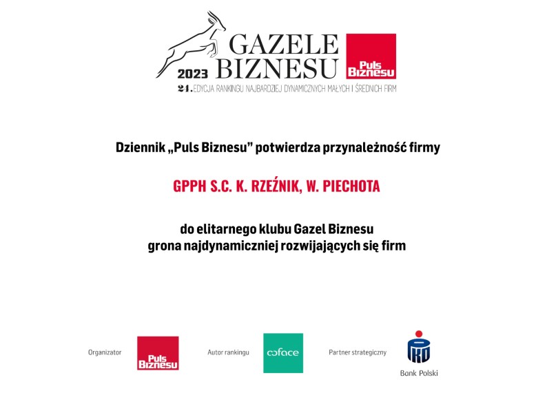 Ponadto firma została uhonorowana nagrodą Gazele Biznesu 2023 za swoje osiągnięcia. Według rankingu Puls Biznesu, GPPH jest najszybciej rozwijającą się firmą w Mielcu. Dodatkowo, firma znalazła się na 12. miejscu w całej Polsce wśród firm o podobnym profilu działalności (PKD 25.11.Z - Produkcja konstrukcji metalowych i ich części). To dowód na to, że GPPH ciągle dąży do przewyższania oczekiwań klientów i zapewniania najlepszych rozwiązań na rynku.