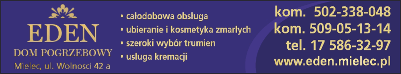 Różaniec za duszę Zmarłego zostanie odmówiony w Domu Pogrzebowym „EDEN” w Mielcu w dniu 15 kwietnia 2026 r. (środa) o godz. 9.00 Wyprowadzenie Zmarłego z Domu Pogrzebowego „EDEN” do Kościoła pw. Ducha Świętego (Borek) nastąpi w dniu 15 kwietnia (środa) o godz. 9.40 Msza Święta Pogrzebowa odbędzie się o godz. 10.00