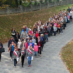 Następnie uczestnicy pielgrzymki wrócili do szkoły, gdzie czekał smakowity, gorący bigos i pieczone specjalnie na tą okoliczność pyszne, chrupiące ciasteczka. Uczniowie otrzymali pamiątkowe breloczki i obrazki Matki Boskiej Zawadzkiej oraz słodycze. Wspaniała pogoda i piękne jesienne widoki świetnie podkreślały nastrój i z pewnością dzień ten na długo pozostanie w pamięci i sercach wszystkich uczestników.