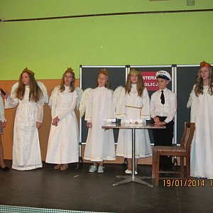 Druga scena przeniosła zebranych na komisariat policji, gdzie zjawił się anioł proszący o ochronę Bożego Narodzenia. Kolejna odsłona ukazała grotę betlejemską, do której zawitały postacie współczesnego świata. Nie mogło więc zabraknąć wójta, policjanta, uczniów, nauczycielki oraz taksówkarza i budowlańca. Widzowie z zainteresowaniem śledzili przebieg akcji, doceniając pomysłową scenografię, którą zaprojektowała i wykonała nauczycielka edukacji wczesnoszkolnej Alina Polak.