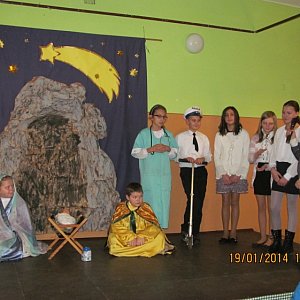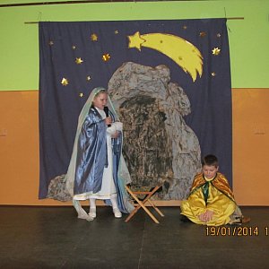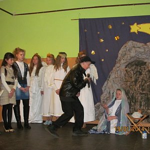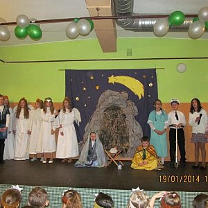 W pierwszej części programu zaprezentowali się uczniowie klas IV- VI, którzy na tle piekielnych ogni widowiskowo ukazali diabelską politykę i poruszenie, jakie wśród poddanych Lucyfera wywołała wieść o mającym się narodzić Dzieciątku.