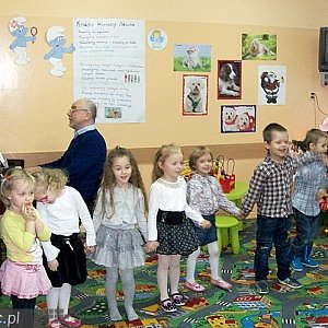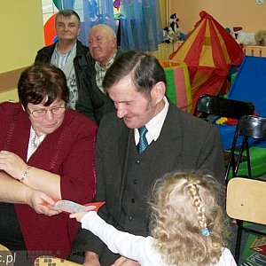 Następnie zebrani usłyszeli piosenki i wierszyki przygotowane specjalnie na tę okazję. Dziewczynki Roksana i Maja zaśpiewały piękną piosenkę o krakowiaczku. Razem wszystkie dzieci zaśpiewały piosenki o małym przedszkolaczku i zielonej żabce do akompaniamentu Andrzeja Guzego. Dzieci wyrecytowały również piękny wierszyk o babciach i dziadkach, którego wspólnie ze swoją opiekunką Panią Moniką Światowiec uczyły się w tajemnicy.