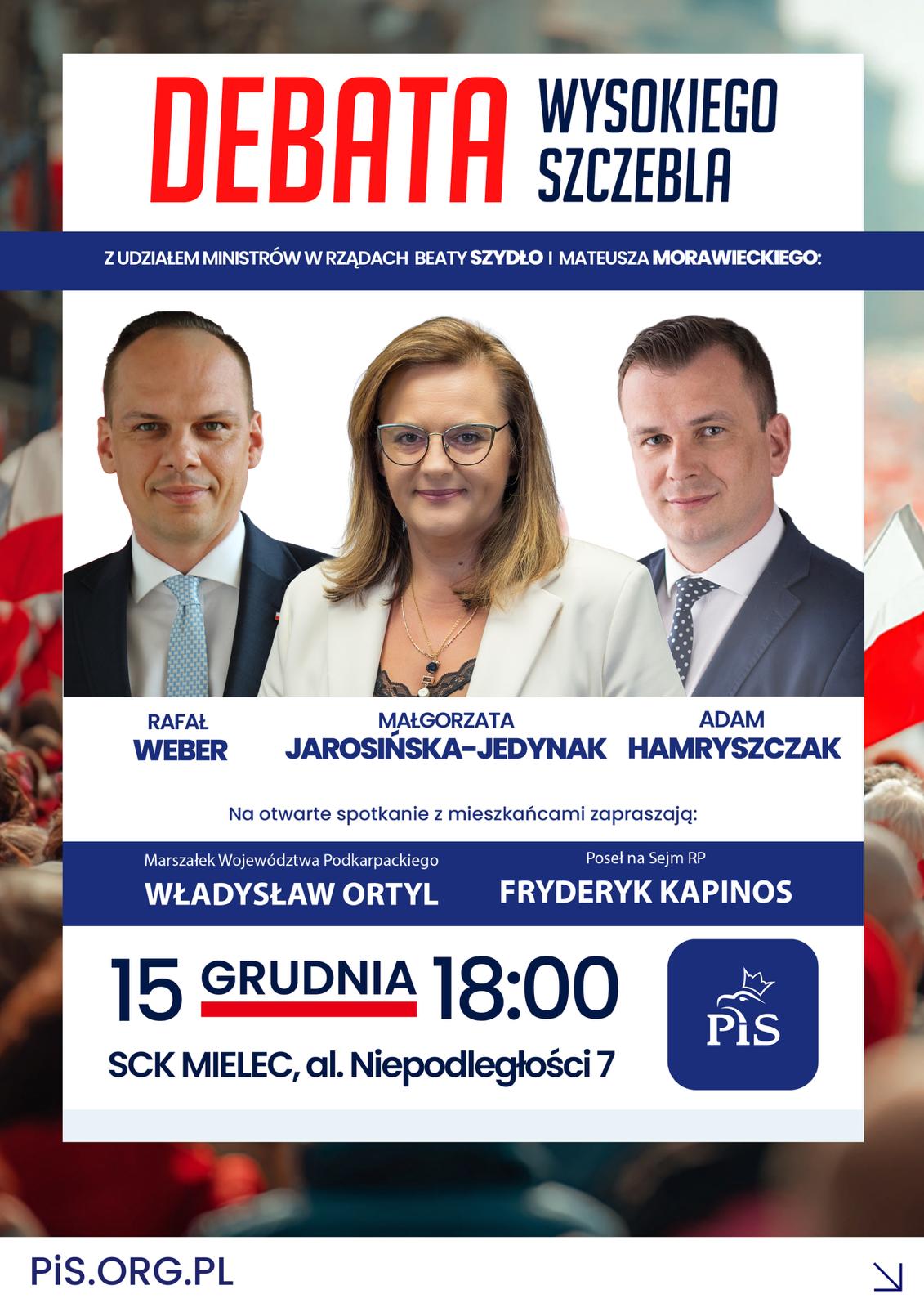 Marszałek Województwa Podkarpackiego Władysław Ortyl i poseł na Sejm RP Fryderyk Kapinos zapraszają na otwarte spotkanie - debatę wysokiego szczebla z ministrami w rządach Beaty Szydło i Mateusza Morawieckiego: Małgorzatą Jarosińską-Jedynak, Rafałem Weberem i Adamem Hamryszczakiem. Temat: „Rozwój Obszarów Przemysłowych. Bezpieczeństwo mieszkańców”.