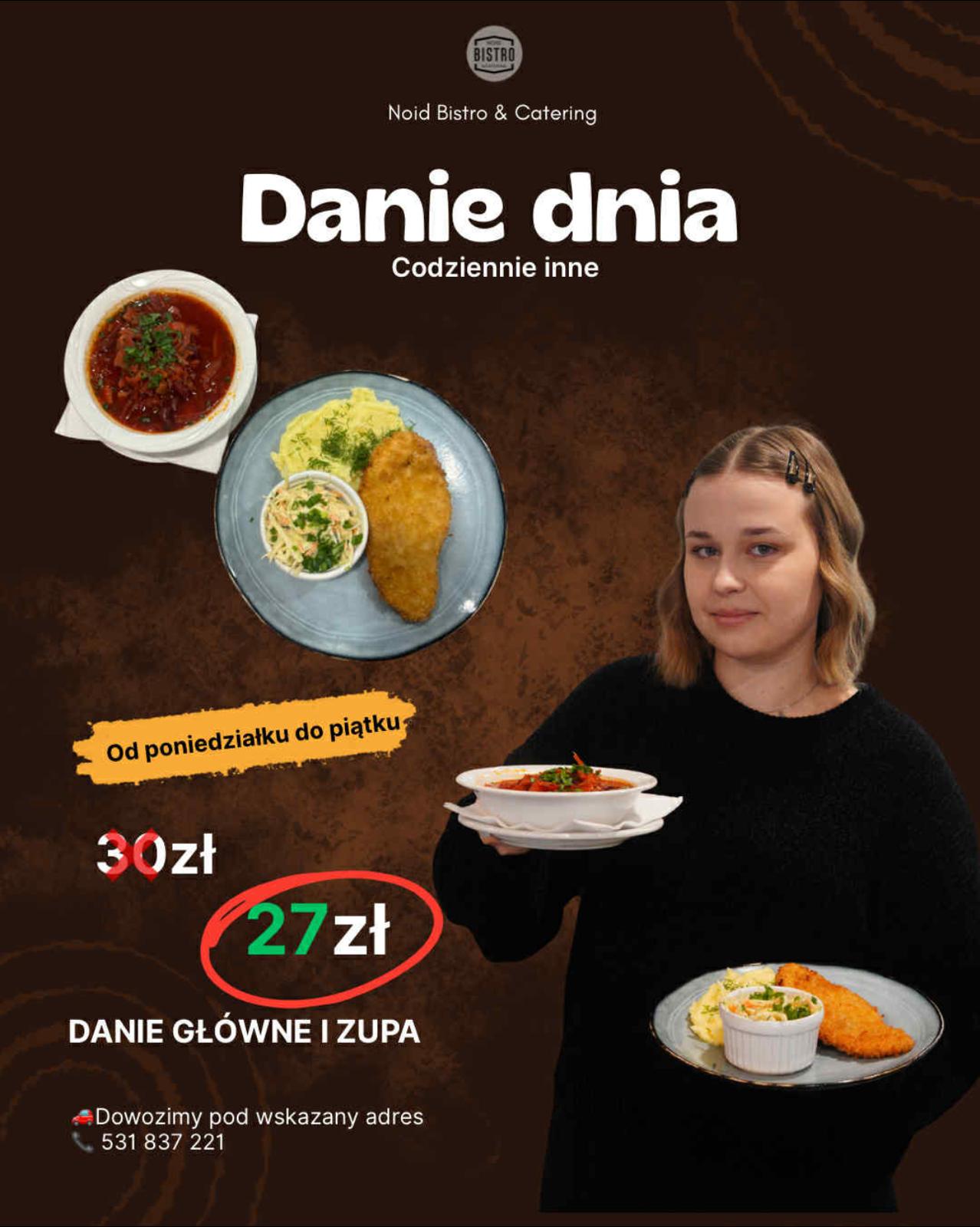 NOID Bistro & Catering, które znajduje się w hali MOSiR na ul. Solskiego 1 w Mielcu, ma dla Was gorącą ofertę. Od poniedziałku do piątku każdy dzień przynosi nowe, smaczne propozycje dania głównego w połączeniu z zupą – wszystko w styczniu za zaledwie 27 zł!
