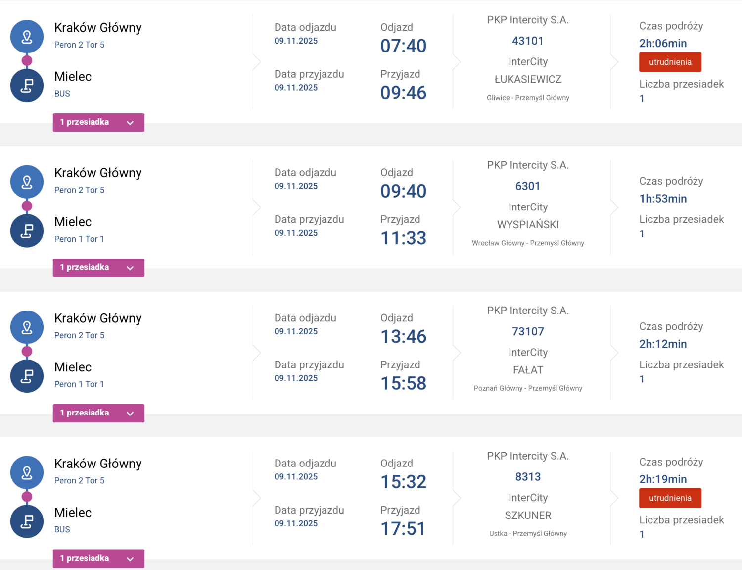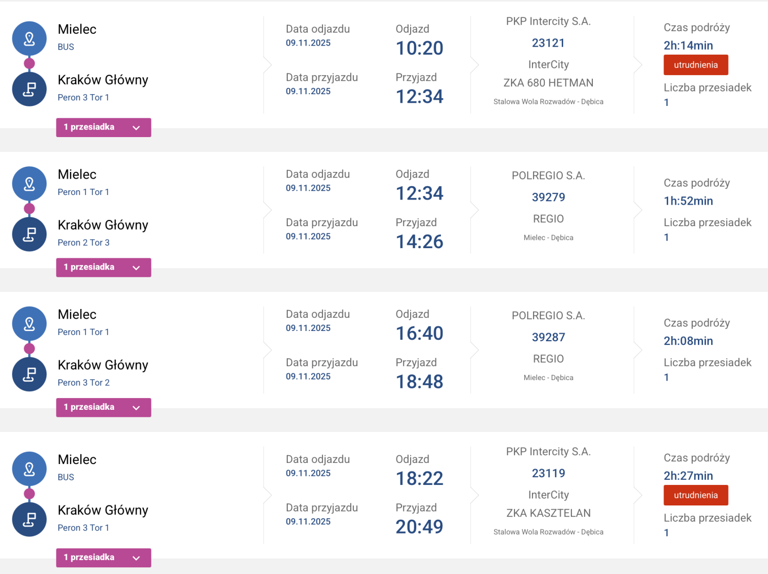 Obecnie nie ma bezpośredniego połączenia Mielec – Kraków, niezbędna staje się przesiadka w Dębicy, gdzie można dojechać kolejowym busem lub szynobusem. Na przykład, dla niedzieli 9 listopada znajdujemy cztery takie połączenia. W dni robocze jest ich więcej Szczegóły są w rozkładzie jazdy PKP.