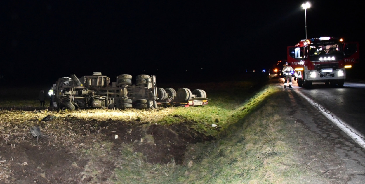 Zdarzenie miało miejsce w środę po godz. 21, w Zarszynie. Ze wstępnych ustaleń policjantów wynika, że 42-letni kierujący samochodem ciężarowym marki Volvo, jechał w kierunku Sanoka. W pewnym momencie doszło do rozerwania jednej z opon w pojeździe. W wyniku tego kierujący utracił panowanie nad samochodem i zjechał z drogi, gdzie volvo przewróciło się na bok.
