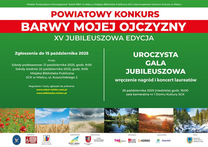 Polskie Towarzystwo Gimnastyczne „Sokół 1893” w Mielcu oraz Miejska Biblioteka Publiczna SCK w Mielcu zapraszają uczniów klas VII i VIII szkół podstawowych oraz szkół ponadpodstawowych z terenu miasta i powiatu mieleckiego do udziału w XV Powiatowym Konkursie Poezji i Piosenki „Barwy Mojej Ojczyzny”.