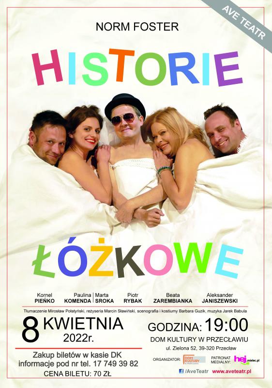"Historie łóżkowe", to jedna z najlepszych komedii kanadyjskiego autora Norma Fostera, w której przedstawia on zabawne, ale też wzruszające losy mieszkańców pewnego miasteczka gdzieś... Cokolwiek by nie powiedzieć o parze uprawiającej miłość na antenie radia, podstarzałej gwieździe rocka i jego fance, włamywaczach, szefie klubu go - go, striptizerce z ręką na temblaku, to i tak wszyscy wylądują w łóżku... ewentualnie tuż obok."Historie łóżkowe", to spektakl, w którym bohaterowie, czasami zabawnie nieporadni, tak jak i my wszyscy poszukują miłości, akceptacji i bliskości drugiego człowieka.