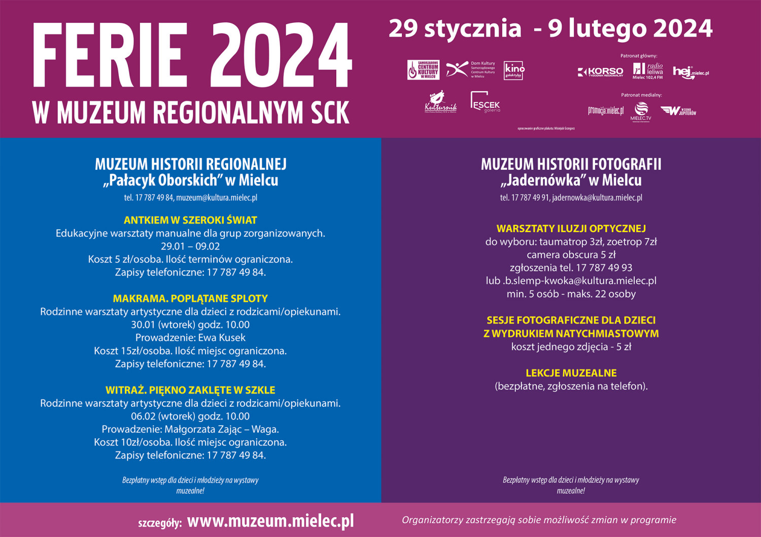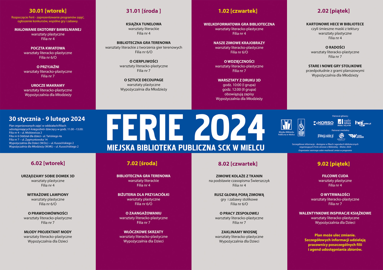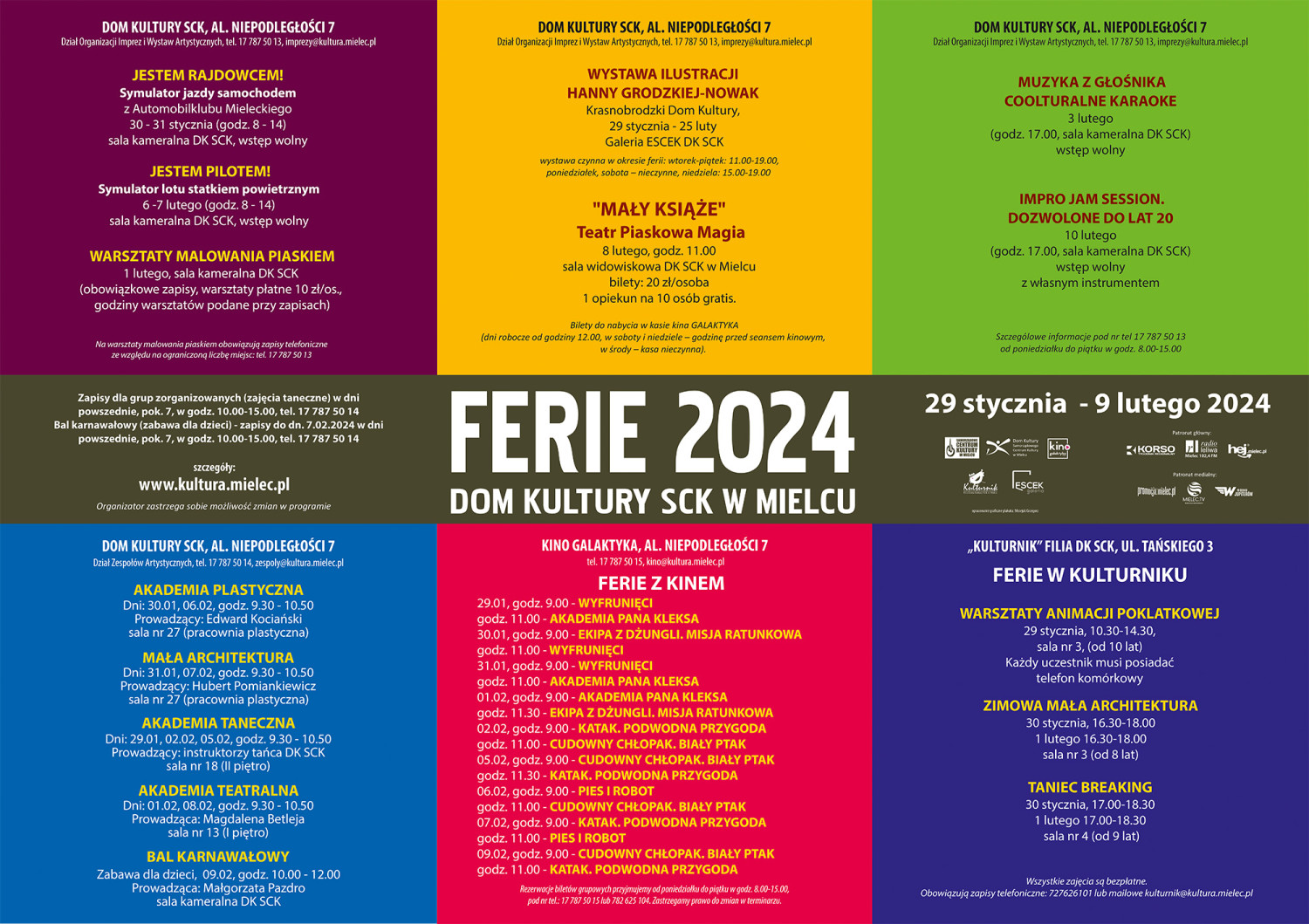 Plan działań realizowanych w Samorządowym Centrum Kultury w Mielcu podczas ferii zimowych 2024 r. w dniach 29 stycznia – 11 luty to m.in.: