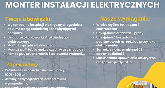 Poszukiwany pracownik na stanowisko "Elektromonter instalacji elektrycznych" Miejsce pracy: Elektron-tech Michał ... czytaj więcej