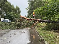 Duże drzewo wywróciło się na drogę Mielec - Kolbuszowa w Biesiadce po nawałnicy, która przeszła nad Podkarpaciem wieczorem 29 sierpnia 2023 roku.