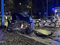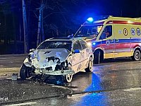Stary, drewniany słup telekomunikacyjny złamał się u podstawy i przewrócił na chodnik przy ul. Żeromskiego - przy zakładzie pogrzebowym. 7 lutego 2024 r.